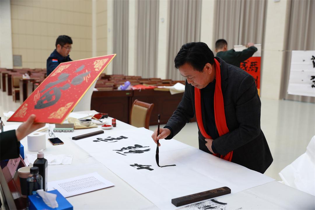 活動現(xiàn)場,書畫家們揮毫潑墨,將新春祝福和美好祝愿凝聚筆端,送到軍嫂軍娃和官兵代表手中,翰墨飄香中交織著歡聲笑語。壓紙、蘸墨、起筆、收筆,一起一落間,一張張蒼勁有力、筆走龍蛇的“?!弊周S然紙上,一幅幅濃墨重彩、寓意吉祥的“花開富貴”圖栩栩如生。禮堂里人頭攢動,大家簇?fù)碓跁ㄋ囆g(shù)家們身邊,看著他們的作品嘖嘖稱贊。