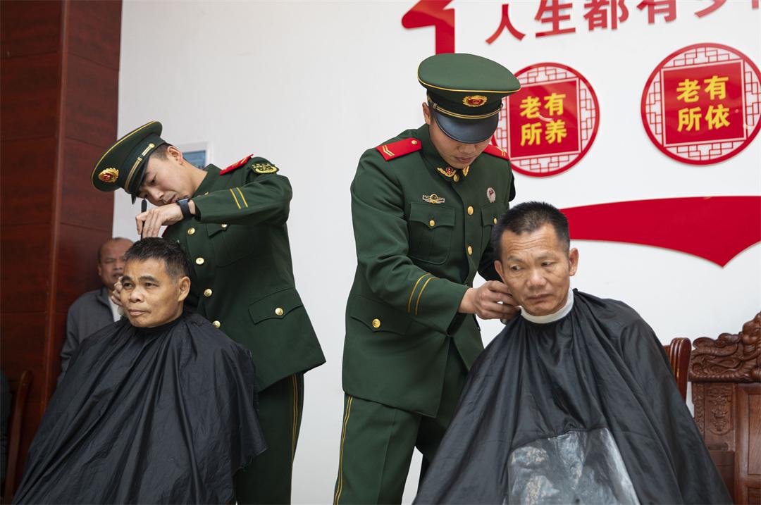 圖為武警官兵為老人理發(fā)。