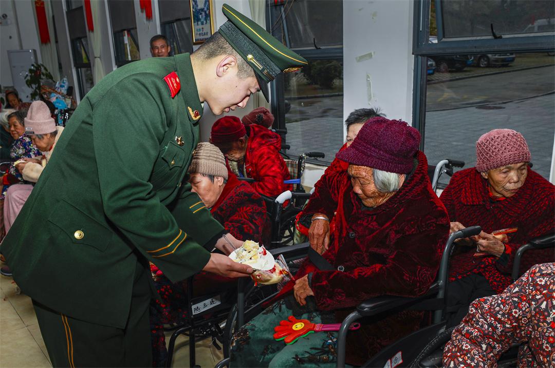 活動期間,官兵們陪老人一起過集體生日,為他們送上隊列演示、軍歌合唱以及舞蹈表演等節(jié)目,現(xiàn)場歡聲笑語不斷。集體生日結(jié)束后,官兵們立即忙活起來,幫助老人理發(fā)、量血壓、整理內(nèi)務(wù)衛(wèi)生,陪著老人下棋、拉家常等,用真誠和溫暖為老人們送去愛心。