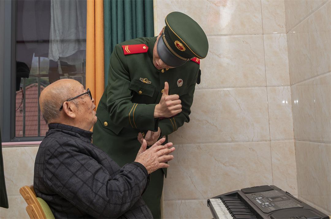 圖為武警官兵陪老人彈奏電子琴。
