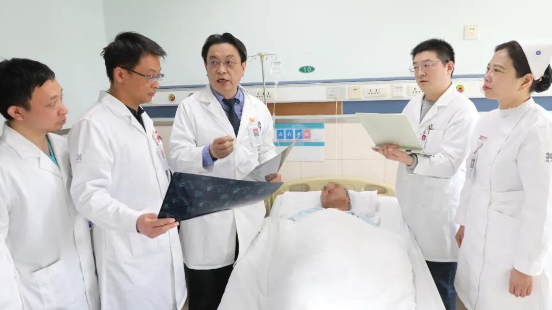 圖為姜凱主任帶領(lǐng)團隊醫(yī)務人員在查房中討論病情,并指導手術(shù)后的病人進行科學訓練,加快康復進度。