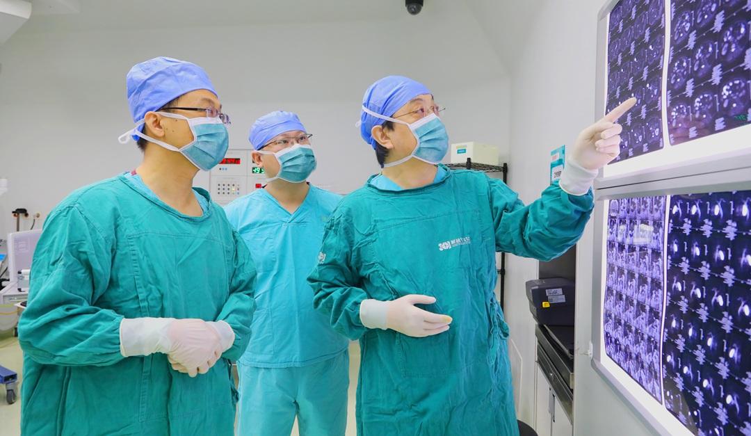 圖為姜凱主任團隊一邊查閱核磁膠片一邊討論手術(shù)細節(jié),制定周密方案,確保手術(shù)萬無一失。