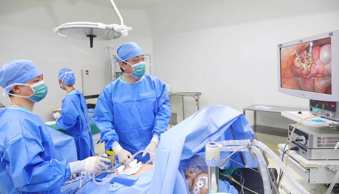 圖為姜凱主任團隊醫(yī)護人員在手術(shù)中精密配合、精準施治,將肝部病灶徹底處理。
