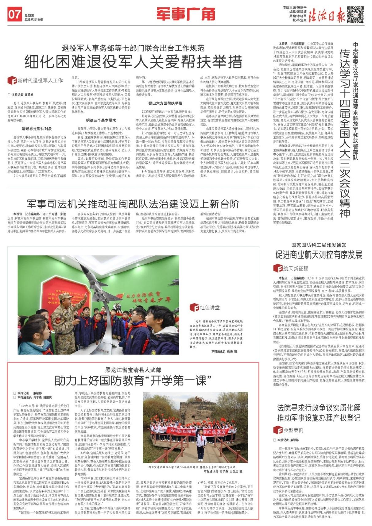 連日來(lái),寶清縣中小學(xué)紛紛開展形式各樣的國(guó)防教育活動(dòng):第一中學(xué)大禮堂內(nèi)座無(wú)虛席,參戰(zhàn)老兵結(jié)合寶清解放講授的國(guó)防教育課,點(diǎn)燃莘莘學(xué)子愛國(guó)熱情;在第二中學(xué)大操場(chǎng),全校師生用莊嚴(yán)的升國(guó)旗、唱國(guó)歌、頌英雄方式,增強(qiáng)好好學(xué)習(xí)報(bào)效祖國(guó)的責(zé)任感和使命感;博名高級(jí)中學(xué)通過組織“紅色傳承·國(guó)防教育”進(jìn)校園主題宣講,激勵(lì)學(xué)生們“吾輩當(dāng)自強(qiáng)”;實(shí)驗(yàn)學(xué)校則利用樓廊文化開展“傳承紅色基因、弘揚(yáng)愛國(guó)精神”國(guó)防知識(shí)展覽,營(yíng)造濃厚的愛黨、愛國(guó)、愛軍紅色文化氛圍。