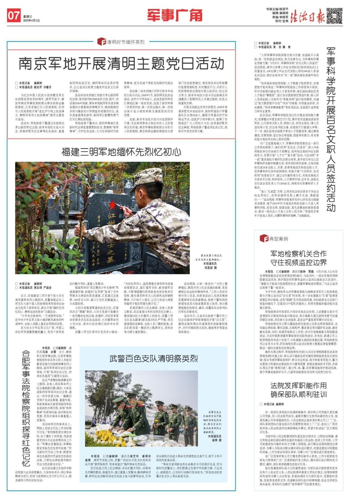 為紀(jì)念中國(guó)人民抗日戰(zhàn)爭(zhēng)暨世界反法西斯戰(zhàn)爭(zhēng)勝利80周年,清明節(jié)前夕,解放軍南京軍事檢察院聯(lián)合南京鐵路運(yùn)輸檢察院、江蘇省鎮(zhèn)江市人民檢察院、蘇州市人民檢察院開展“追憶滬寧線上抗戰(zhàn)烽火 賡續(xù)傳承偉大抗戰(zhàn)精神”清明主題黨日活動(dòng)。