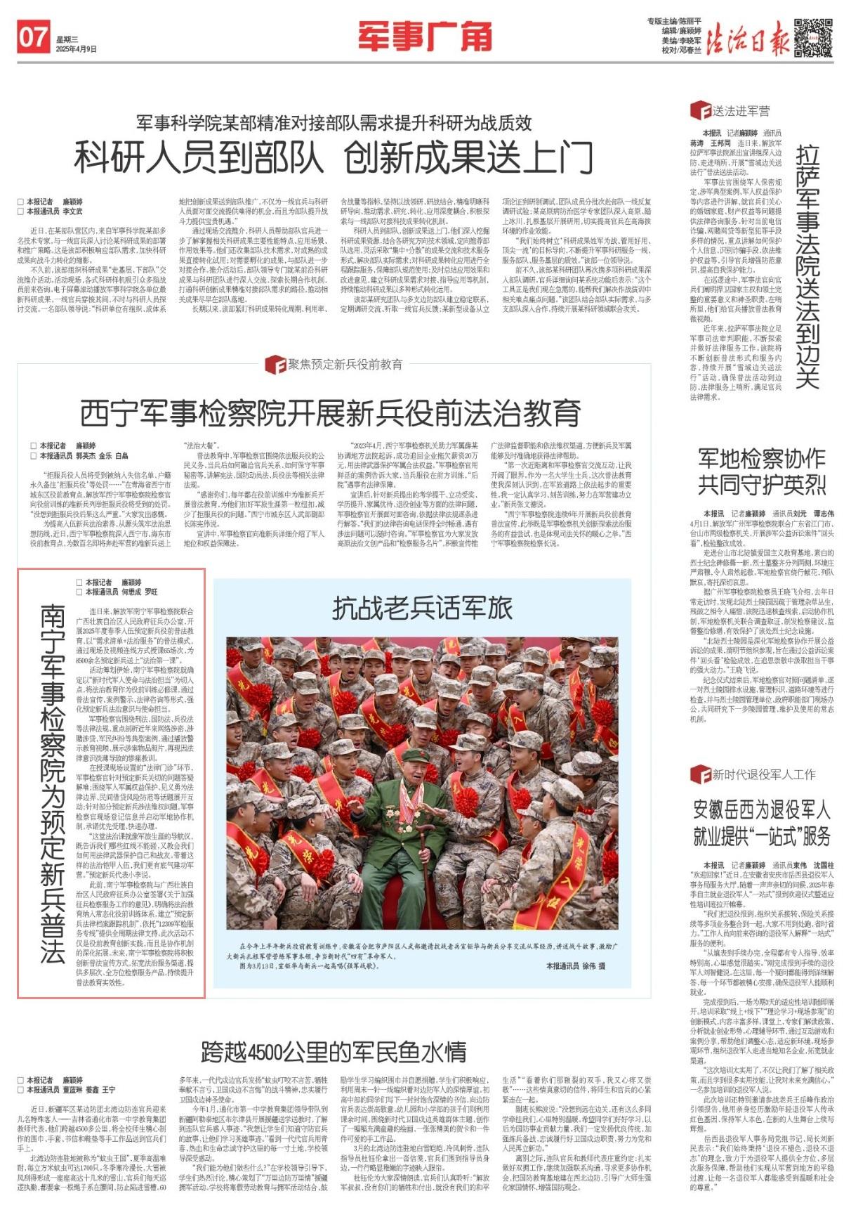 連日來(lái),解放軍南寧軍事檢察院聯(lián)合廣西壯族自治區(qū)人民政府征兵辦公室,開(kāi)展2025年度春季入伍預(yù)定新兵役前普法教育,以“需求清單+法治服務(wù)”的普法模式,通過(guò)現(xiàn)場(chǎng)及視頻連線方式授課65場(chǎng)次,為8500余名預(yù)定新兵送上“法治第一課”。