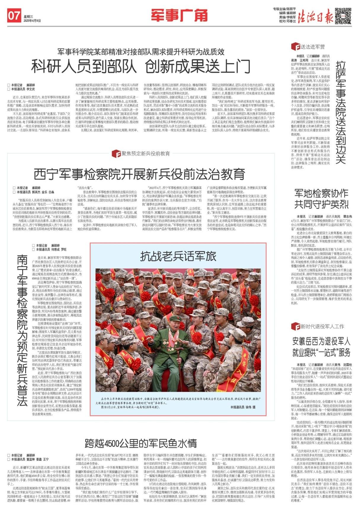 在今年上半年新兵役前教育訓(xùn)練中,安徽省合肥市廬陽區(qū)人武部邀請抗戰(zhàn)老兵宣鉅華與新兵分享交流從軍經(jīng)歷,講述戰(zhàn)斗故事,激勵廣大新兵扎根軍營苦練軍事本領(lǐng),爭當(dāng)新時代“四有”革命軍人。