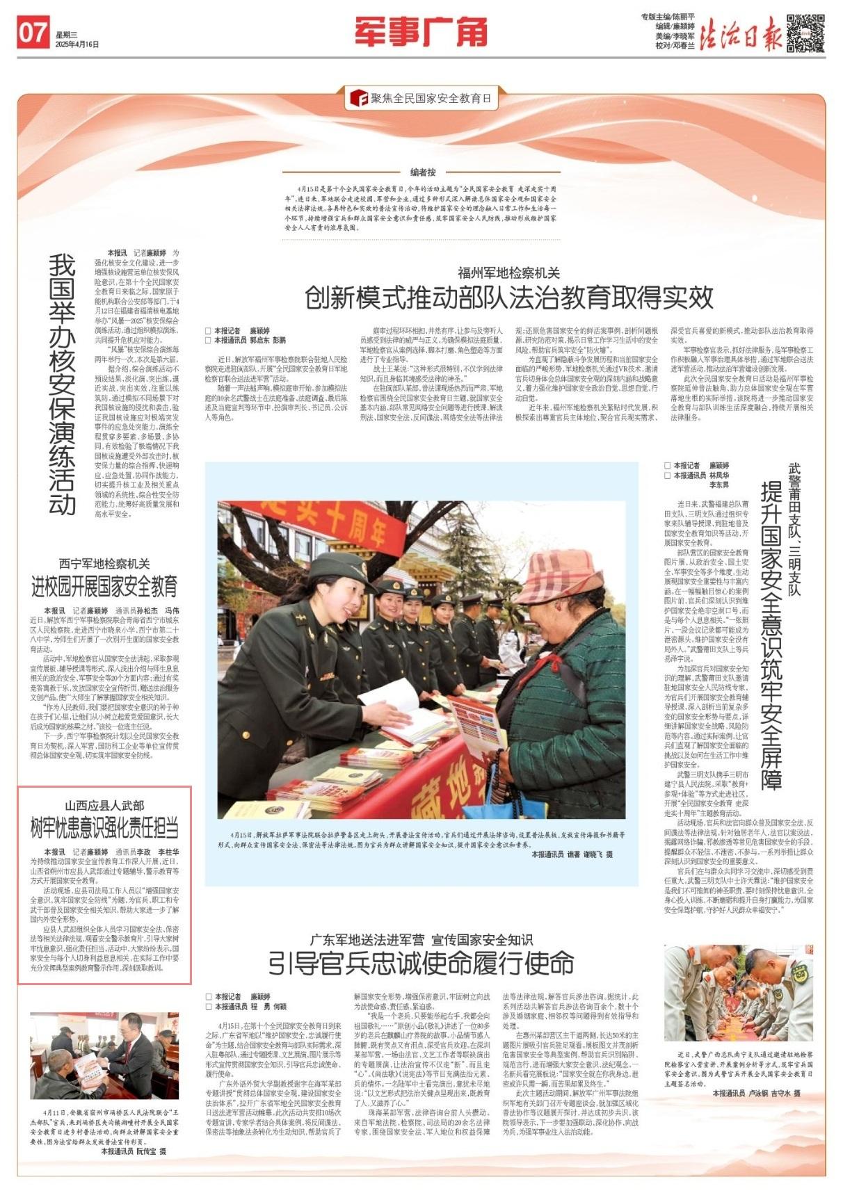 應(yīng)縣人武部組織全體人員學(xué)習(xí)國(guó)家安全法、保密法等相關(guān)法律法規(guī),觀看安全警示教育片,引導(dǎo)大家樹(shù)牢憂患意識(shí)、強(qiáng)化責(zé)任擔(dān)當(dāng)?;顒?dòng)中,大家紛紛表示,國(guó)家安全與每個(gè)人切身利益息息相關(guān),在實(shí)際工作中要充分發(fā)揮典型案例教育警示作用,深刻汲取教訓(xùn)。