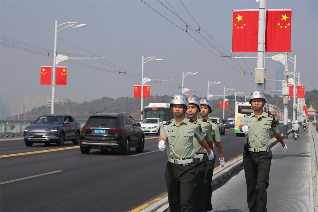 2023年10月1日,警備糾察隊一中隊一班和二班戰(zhàn)士整理軍容、裝備,準(zhǔn)備出發(fā)前往武漢長江大橋。班長胡澤昶是這次行動負(fù)責(zé)人,他給官兵們分配任務(wù):“這次行動是一次設(shè)站與流動相結(jié)合的檢查,重點是糾察軍容風(fēng)紀(jì)和軍車運行秩序。到達(dá)現(xiàn)場后,采取小群多路、分組行動方式展開任務(wù)?!?小時內(nèi),他們共檢查5輛過往軍車、核查3名外出軍人證件,通過“黑”面執(zhí)法嚴(yán)軍紀(jì)。