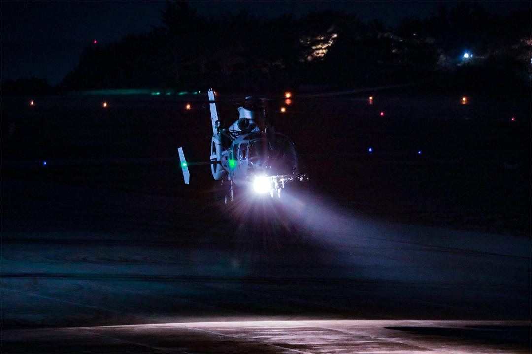 圖為海上跨晝夜平臺著艦飛行訓練。