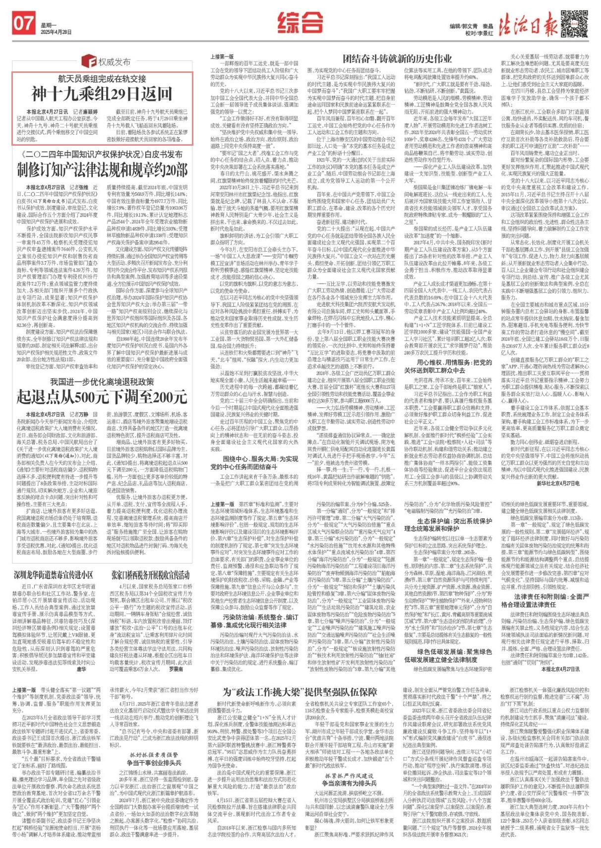 截至目前,神舟十九號航天員乘組已完成全部既定任務(wù),將于4月29日乘坐神舟十九號載人飛船返回東風(fēng)著陸場。