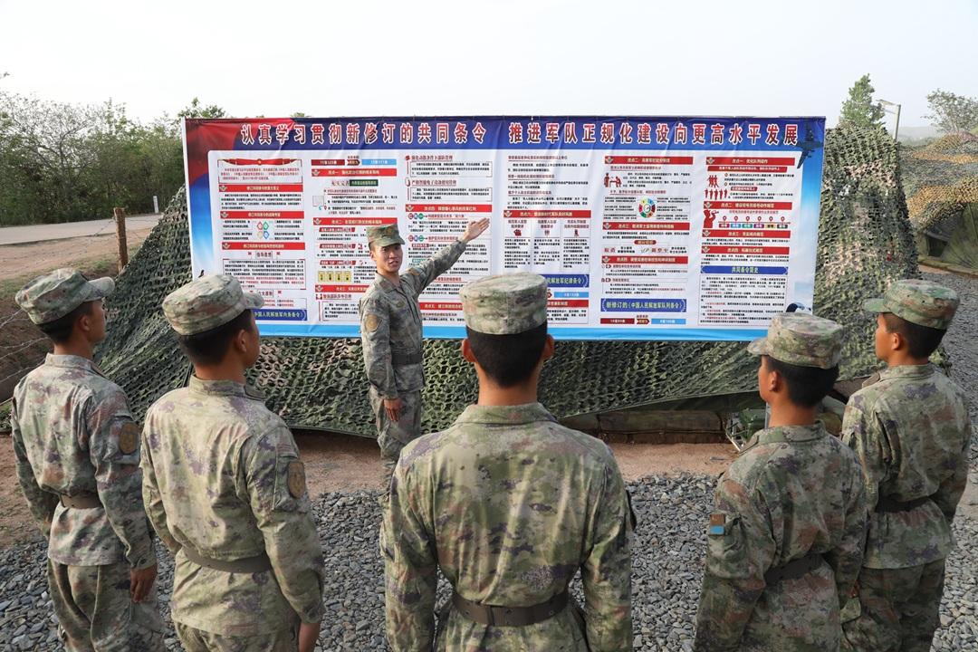 4月23日,空降兵某旅野外駐訓分隊持續(xù)強化官兵學用新共同條令的意識。圖為骨干利用宣傳展板為官兵講解新條令。王彬 攝
