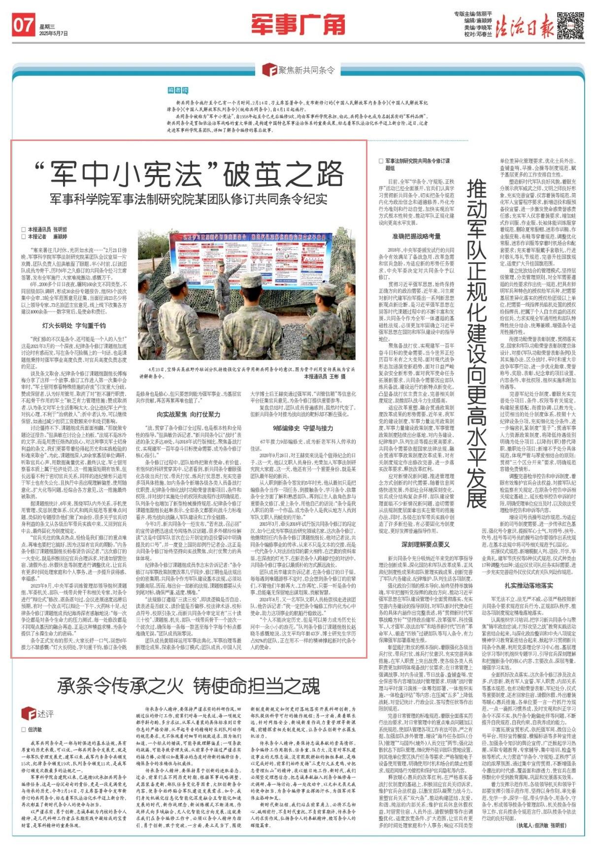 2015年3月,牽頭2018年試行版共同條令修訂的馮定漢,如今已成為軍事法治研究領域名家。這次條令修訂,他繼續(xù)擔任內務條令修訂課題組組長。他對記者說,共同條令編修事業(yè)的傳承,從來不只是文本的交接,而是一代代條令人對法治信仰的薪火相傳。在泛黃的資料庫里,在深夜的燈光下,在新老條令人跨越時空的對話中,共同條令修訂事業(yè)以最質樸的方式源遠流長。