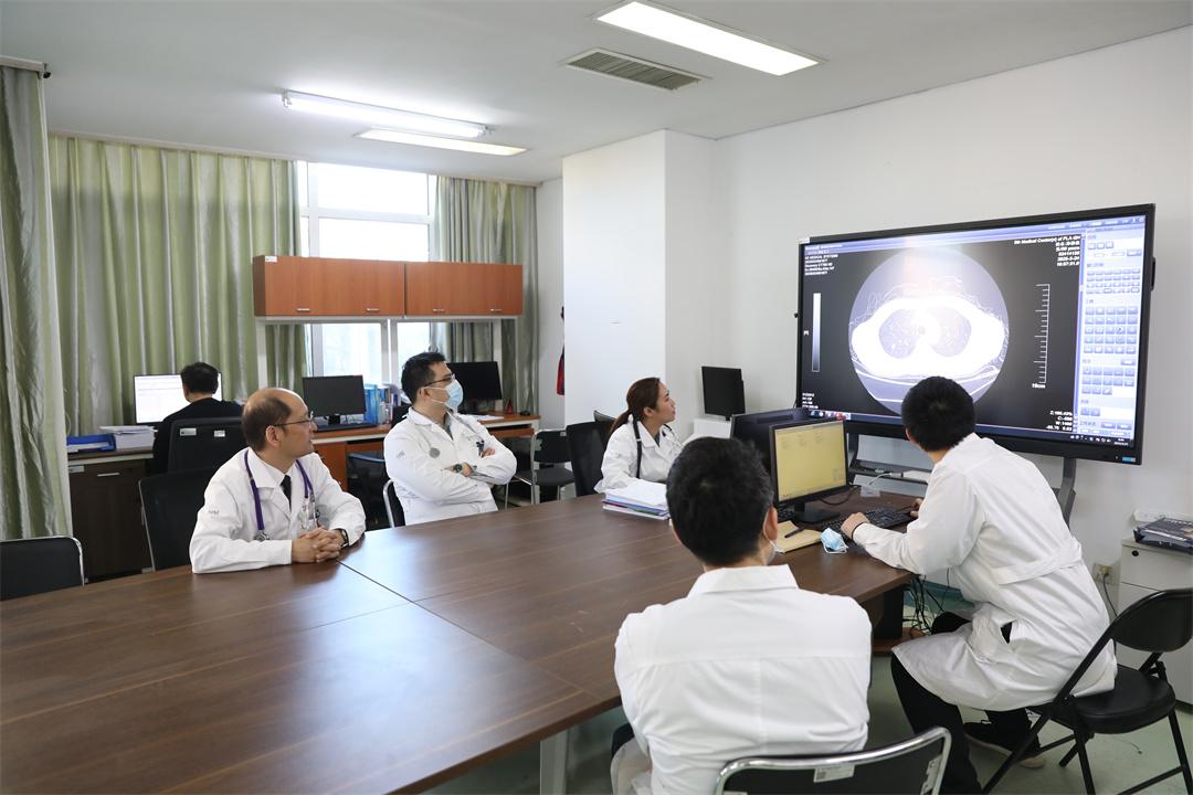 圖為胸外科主任宋偉安帶領(lǐng)團(tuán)隊研究胸部CT和病情資料。