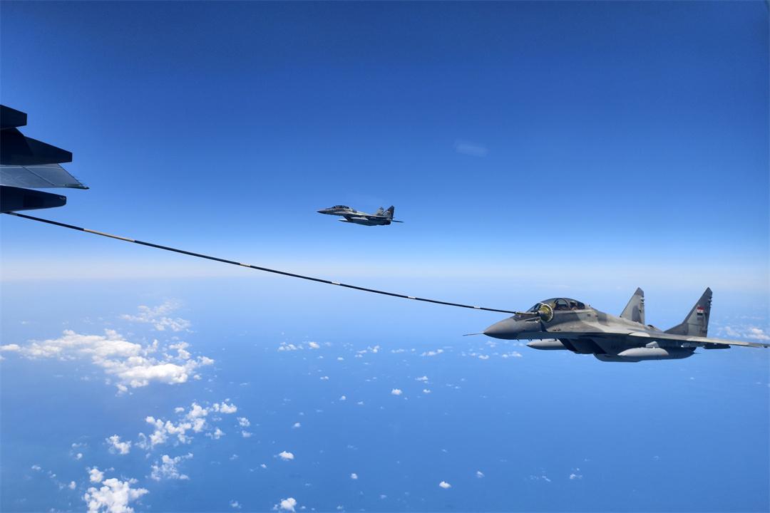 圖為4月28日,參加中埃“文明之鷹-2025”空軍聯合訓練的中國空軍運油-20飛機和埃及空軍米格-29飛機進行空中加油訓練。余紅春 攝