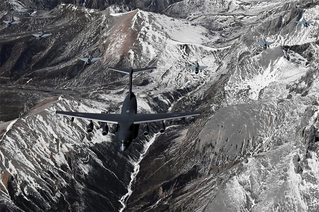 圖為4月12日,中國境內,參加中?!拔拿髦?2025”空軍聯合訓練的運油-20和殲-10戰(zhàn)機編隊飛躍雪山。余紅春 攝