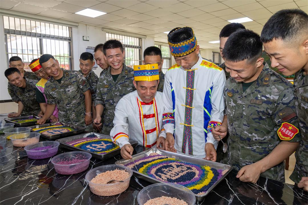 圖為武警官兵和壯鄉(xiāng)群眾共同制作五色糯米飯。