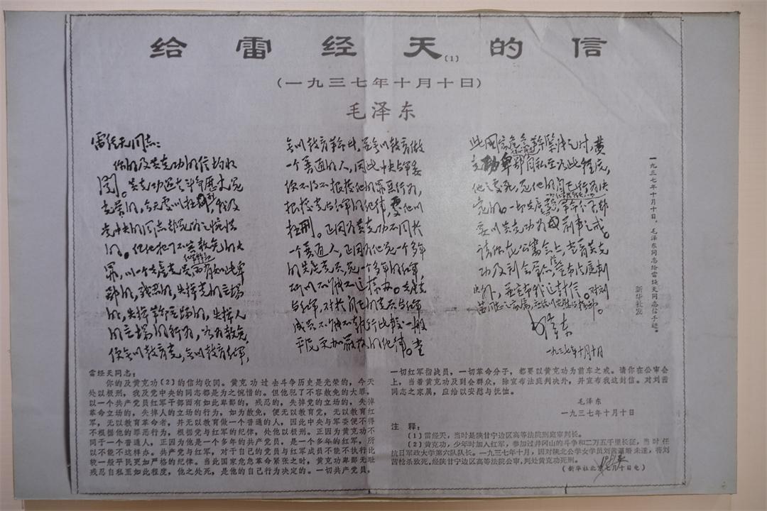 圖為陳列館展出的毛澤東給審判長(zhǎng)雷經(jīng)天的信。韓瀟 攝