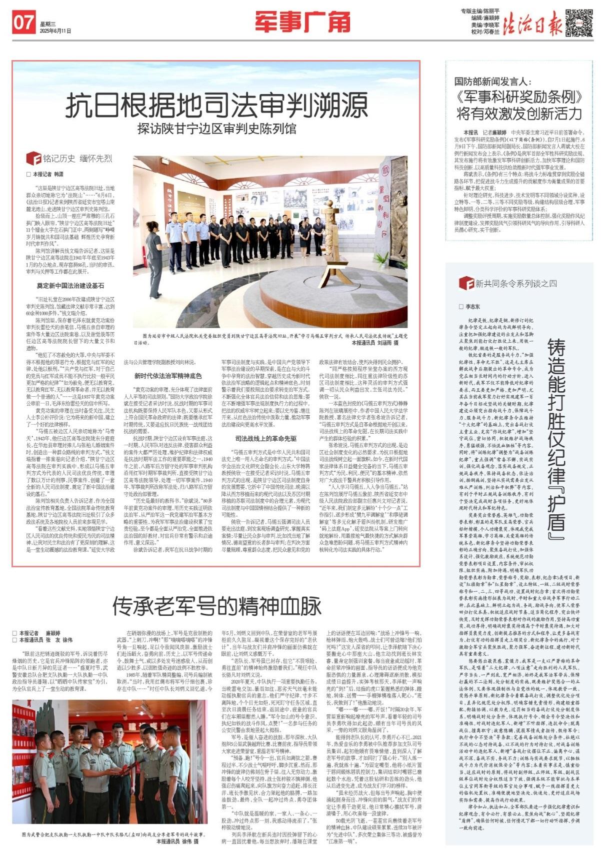 徐斌告訴記者,我軍在抗日戰(zhàn)爭(zhēng)時(shí)期的軍事司法制度與實(shí)踐,是中國(guó)共產(chǎn)黨領(lǐng)導(dǎo)下軍事法治建設(shè)的早期探索,是在血與火的斗爭(zhēng)中孕育的法治智慧,穿越歷史成為新時(shí)代依法治軍戰(zhàn)略的邏輯起點(diǎn)和精神底色。時(shí)刻警示著我們要按照法治要求轉(zhuǎn)變治軍方式,不斷強(qiáng)化全體官兵法治信仰和法治思維;要在不斷增強(qiáng)軍事法規(guī)制度執(zhí)行力的過程中,把法的權(quán)威牢牢樹立起來;要以史為鑒、繼往開來,從紅色法治傳統(tǒng)中汲取力量,推動(dòng)軍事法治建設(shè)向更高水平發(fā)展。