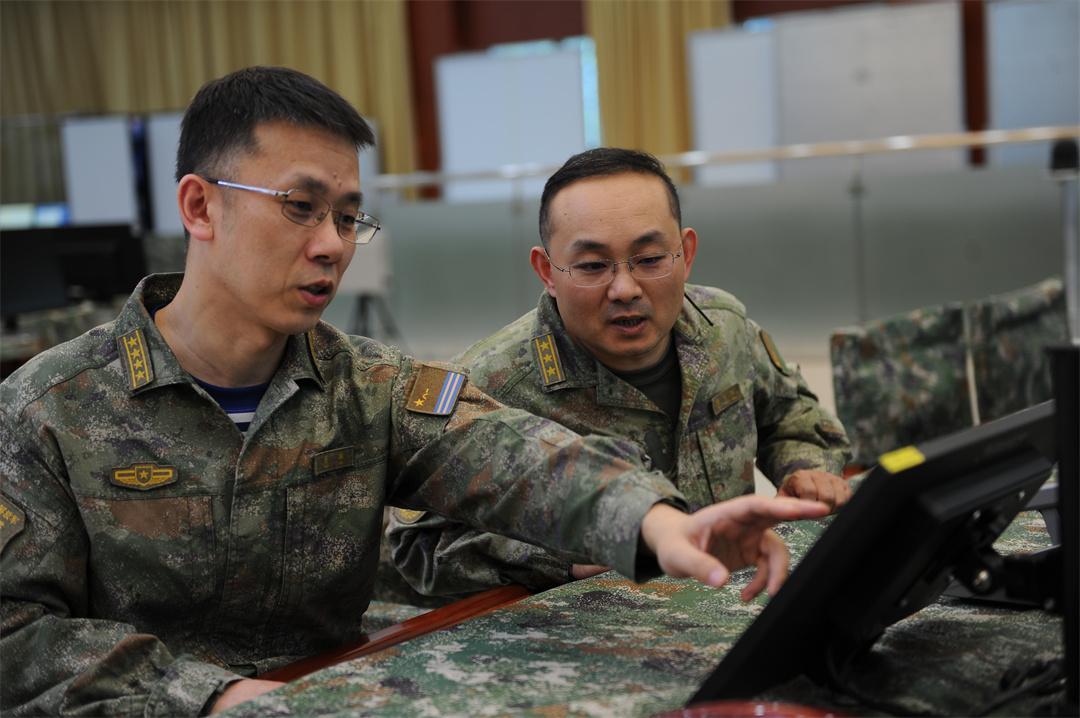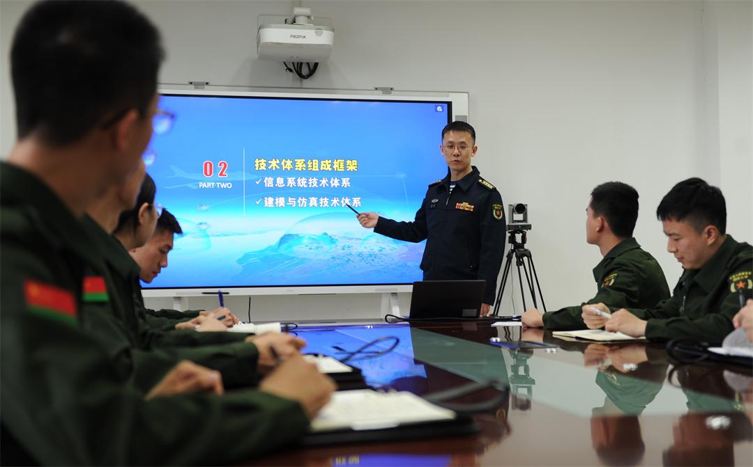 圖為吳琳(右二)和團(tuán)隊成員分析評估戰(zhàn)場態(tài)勢。