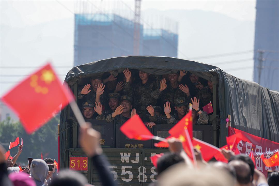 圖為完成抗洪搶險任務后,武警官兵向送行人群揮手告別。趙浩翔 攝