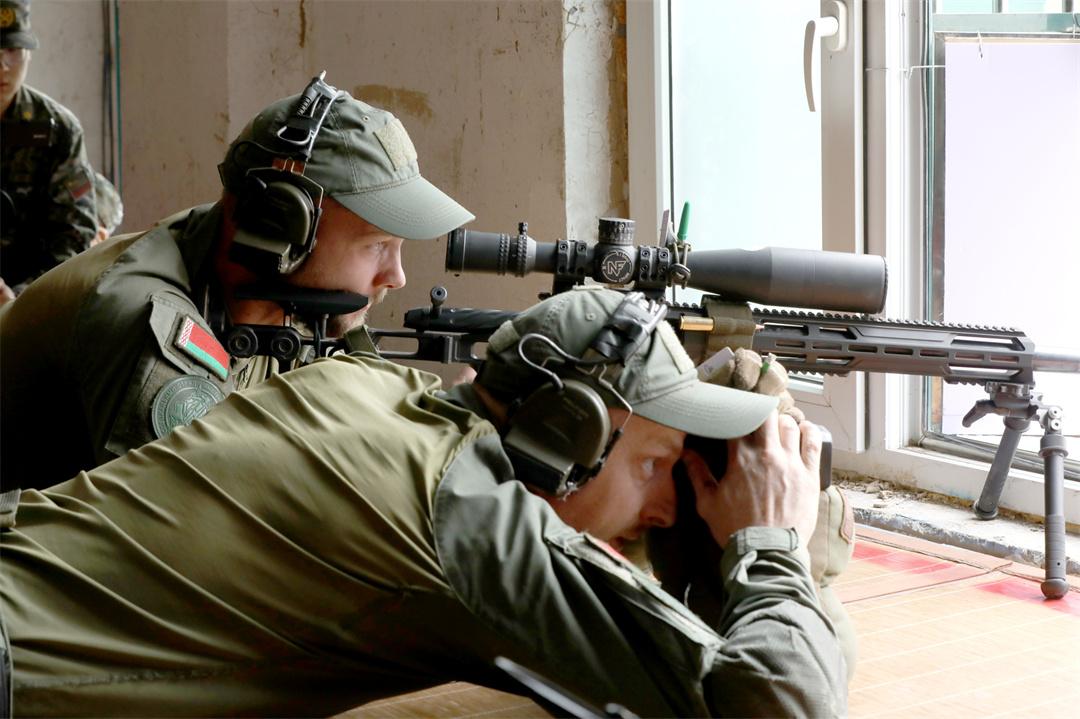 圖為7月17日,白俄羅斯參賽隊(duì)員在新疆烏魯木齊武警部隊(duì)某訓(xùn)練基地參加“城市要點(diǎn)控守狙擊”課目競賽。趙俊杰 攝