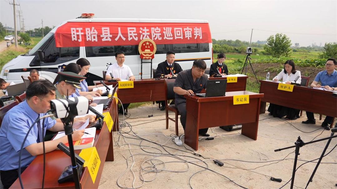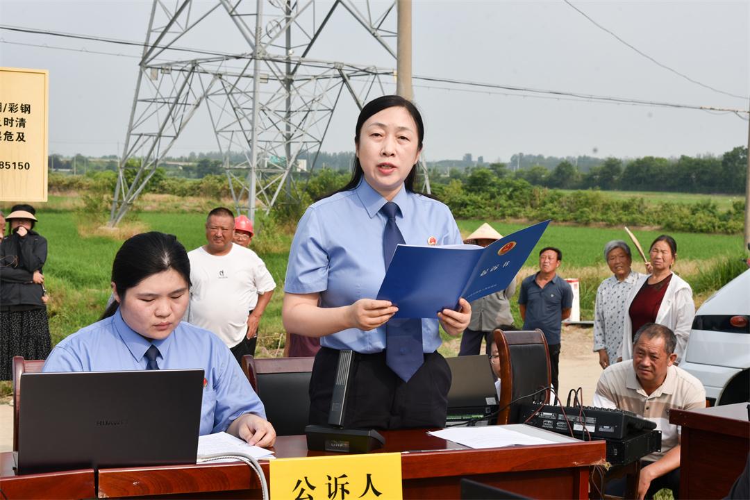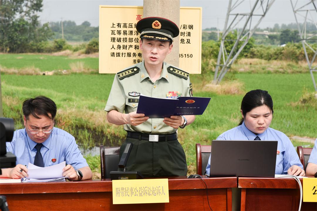 7月15日,解放軍南京軍事檢察院協(xié)同淮安市盱眙縣人民檢察院,對一起過失損壞軍事通信案提起刑事附帶民事公益訴訟,并在案發(fā)地盱眙縣馬壩鎮(zhèn)一處農(nóng)田間公開開庭審理。盱眙縣人民檢察院檢察長潘凌云作為公訴人出庭指控犯罪,南京軍事檢察院大校檢察長劉劍作為附帶民事公益訴訟起訴人出庭提起民事公益訴訟,盱眙縣人民法院院長田庚擔(dān)任審判長。為加大案件警示教育效果,庭審邀請全國人大代表、江蘇省人大代表、部隊(duì)有關(guān)人員,以及案發(fā)地附近村民100余人參與旁聽。