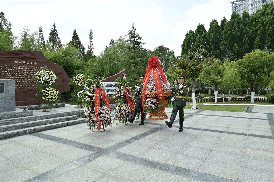國歌聲落,全體肅立,向這位為祖國外交事業(yè)獻(xiàn)出生命的英雄默哀致敬。默哀畢,《獻(xiàn)花曲》深情奏響。禮兵邁著沉穩(wěn)有力的正步,穩(wěn)穩(wěn)抬起寄托緬懷與敬意的花籃,緩步走向烈士雕像基座,整齊擺放在雕像前?,F(xiàn)場領(lǐng)導(dǎo)緩步上前,仔細(xì)整理著緞帶,以此表達(dá)對英烈的崇敬之情。