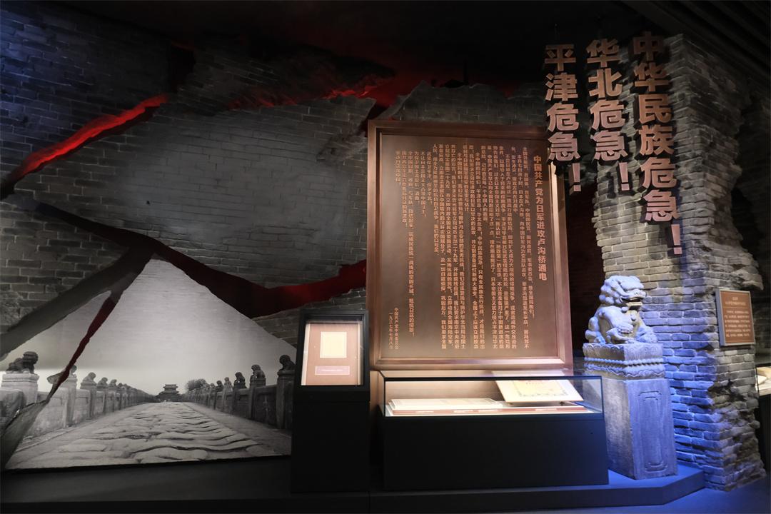 “全中國的同胞們!平津危急!華北危急!中華民族危急!只有全民族實(shí)行抗戰(zhàn),才是我們的出路!”一則《中國共產(chǎn)黨為日軍進(jìn)攻盧溝橋通電》原文被放大并“搬”上展墻,一行行大字尤為醒目,字字千鈞。主題展覽第二部分“七七事變”場(chǎng)景,瞬間將觀眾拉回88年前的盧溝橋畔,也是很多觀眾反饋印象最深刻的場(chǎng)景之一。
