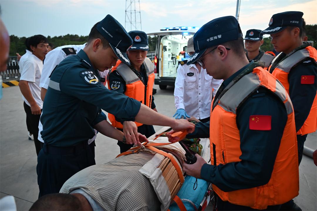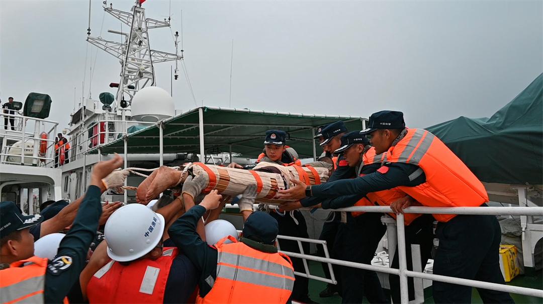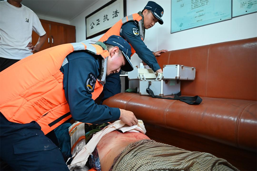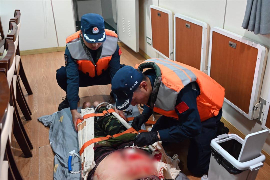 海警執(zhí)法員看準(zhǔn)時(shí)機(jī)在兩船并靠瞬間果斷跳幫,登船緊急開(kāi)展消毒止血、包扎固定等處理后,與漁政工作人員合力將傷員轉(zhuǎn)運(yùn)至海警執(zhí)法艇。隨艇醫(yī)護(hù)人員持續(xù)觀(guān)察救治,安撫傷員情緒,與此同時(shí),崇明海警局聯(lián)系駐地醫(yī)院安排救護(hù)車(chē)趕赴碼頭轉(zhuǎn)接傷員。