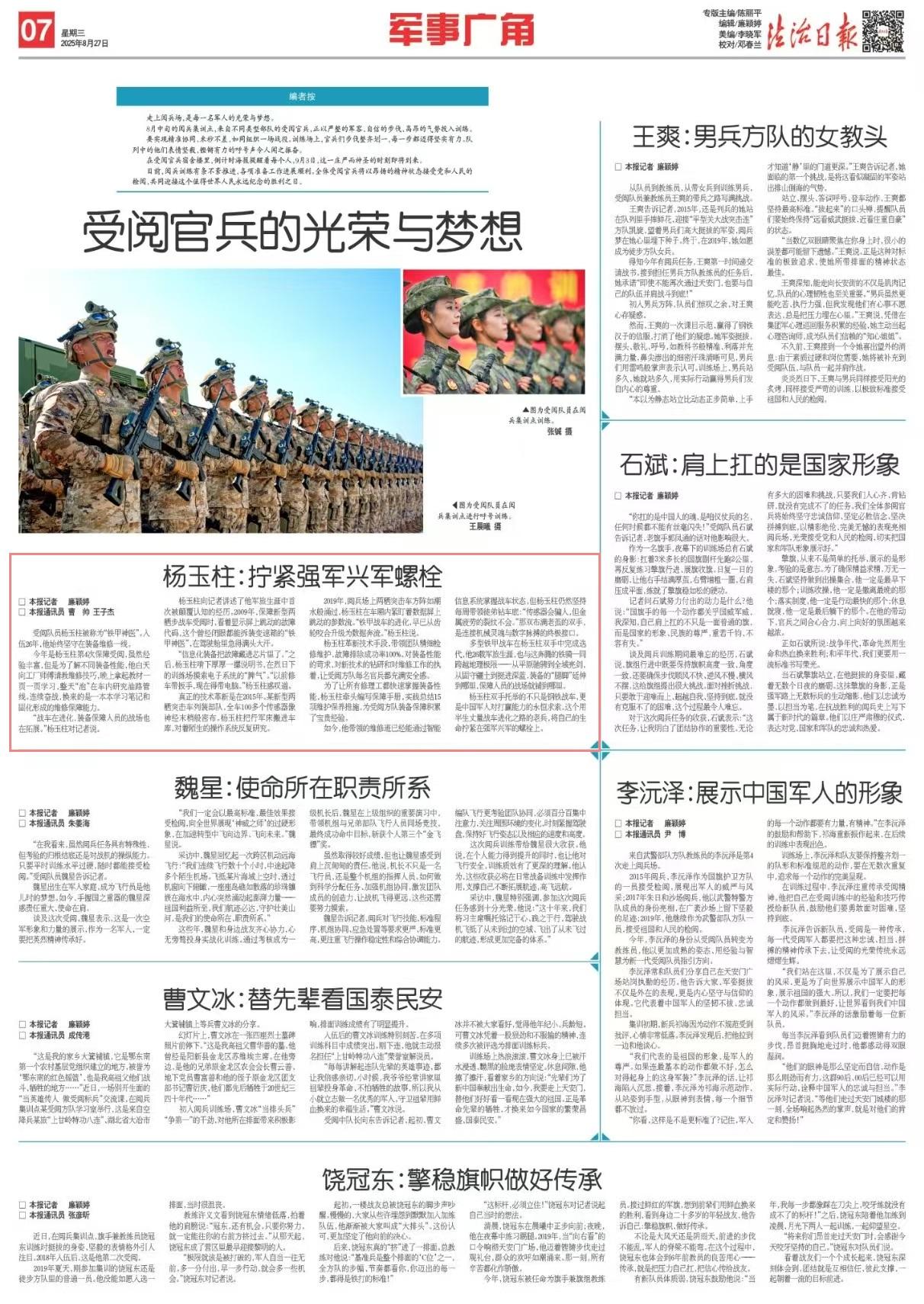 楊玉柱革新技術(shù)手段,帶領(lǐng)團(tuán)隊(duì)精細(xì)檢修維護(hù),對(duì)裝備性能的苛求、對(duì)新技術(shù)的鉆研和對(duì)維修工作的執(zhí)著,讓受閱方隊(duì)每名官兵都充滿安全感。