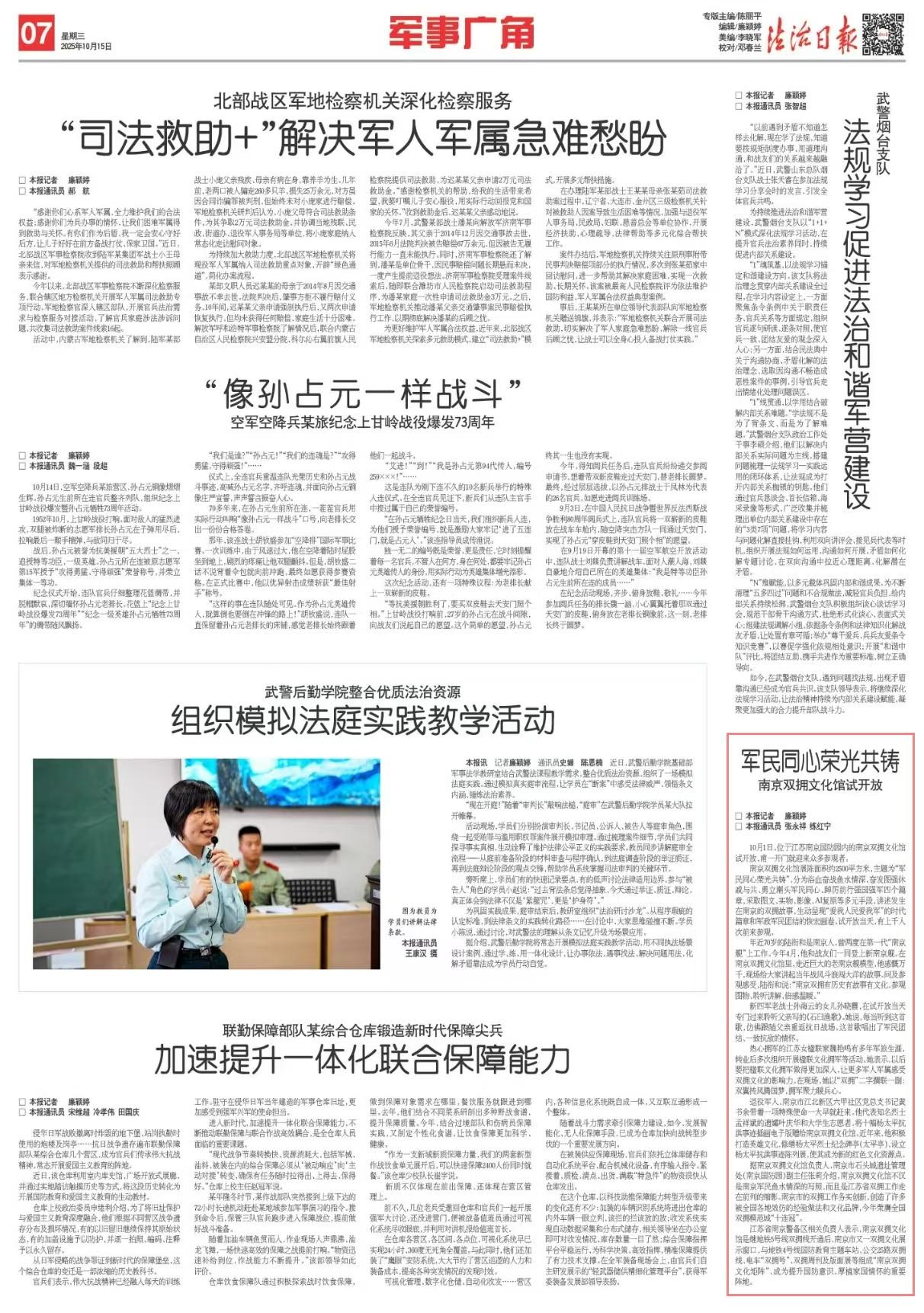江蘇省南京警備區(qū)相關(guān)負責人表示,南京雙擁文化館是繼地鐵5號線雙擁線開通后,南京市又一雙擁文化展示窗口,與地鐵4號線國防教育主題車站、公交25路雙擁線、電車“雙擁號”、雙擁周刊及版面展等組成“南京雙擁文化矩陣”,成為提升國防意識,厚植家國情懷的重要陣地。