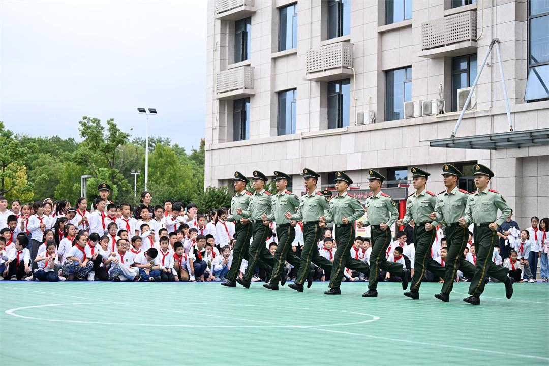 圖為武警戰(zhàn)士向小學生演示隊列動作。