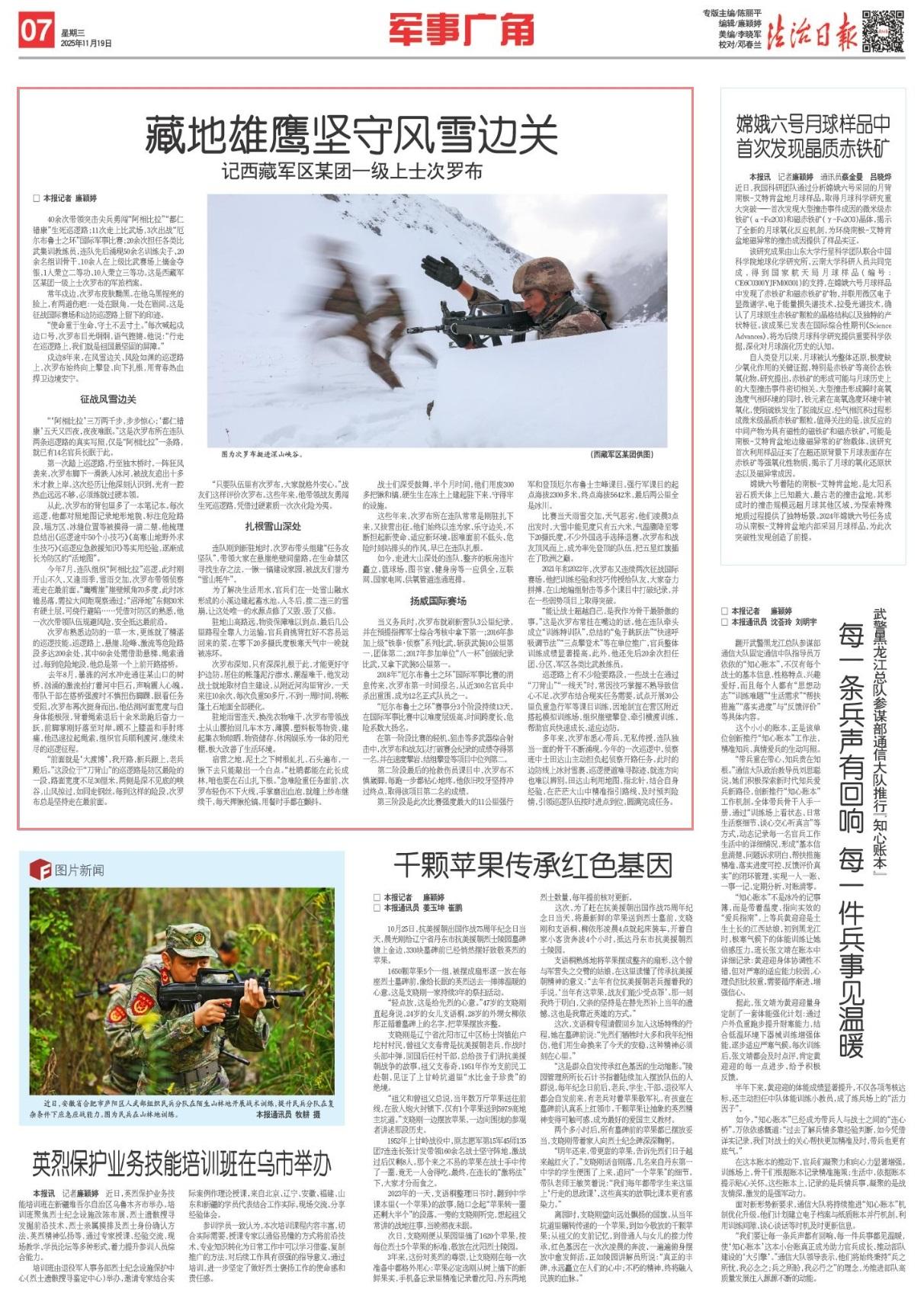 第一次踏上巡邏路,行至獨(dú)木橋時(shí),一陣狂風(fēng)襲來,次羅布腳下一滑跌入冰河,被戰(zhàn)友追出十多米才救上岸。這次經(jīng)歷讓他深刻認(rèn)識到,光有一腔熱血遠(yuǎn)遠(yuǎn)不夠,必須練就過硬本領(lǐng)。