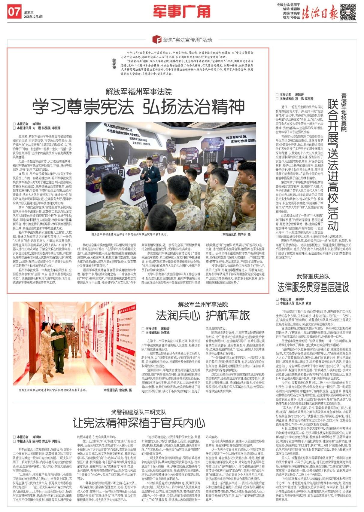 “憲法宣傳周”期間,軍隊及軍地法院、檢察院聯(lián)合,充分發(fā)揮普法宣講團、“法律明白人”作用,圍繞習(xí)近平法治思想、黨的二十屆四中全會精神、中央全面依法治國工作會議精神,以及憲法的規(guī)定、原則和精神,組織開展形式多樣的憲法進軍營普法宣傳活動,引導(dǎo)官兵將法治精神融入練兵備戰(zhàn)和日常工作,筑牢官兵法治信仰,做憲法的忠實崇尚者、自覺遵守者、堅定捍衛(wèi)者。
