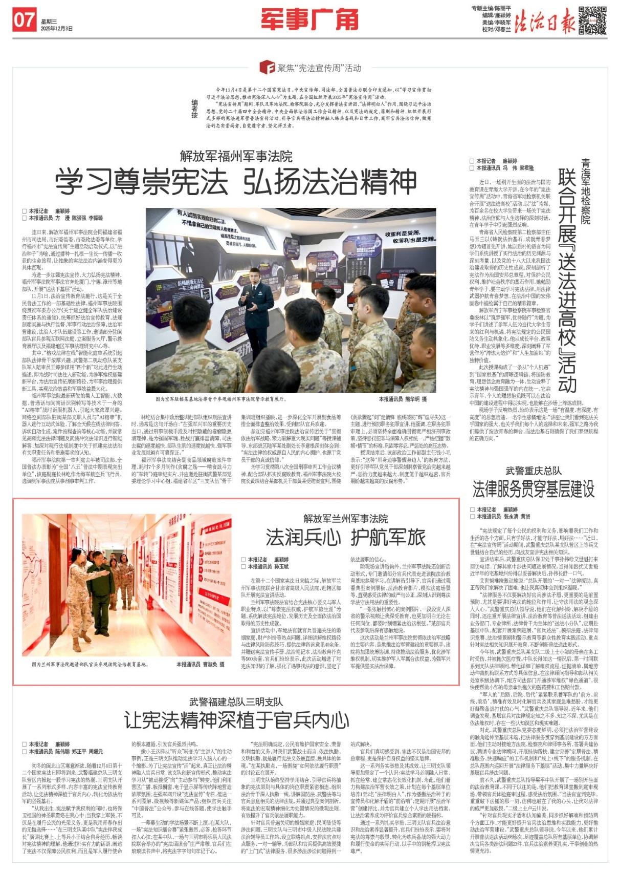 蘭州軍事法院法官結(jié)合憲法核心要義與軍人職業(yè)特點,以“尊崇憲法權(quán)威、護航軍旅生涯”為題,系統(tǒng)解讀憲法地位、發(fā)展歷史及全面依法治國取得的歷史性成就。