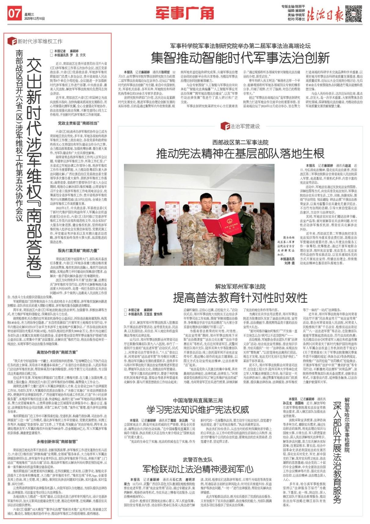 經(jīng)過多年發(fā)展,軍地相關(guān)職能部門在需求上精準(zhǔn)對接、在力量上加強(qiáng)統(tǒng)籌、在資源上強(qiáng)化整合,南部戰(zhàn)區(qū)六?。▍^(qū))涉軍維權(quán)協(xié)作順暢,凝聚強(qiáng)大工作合力。