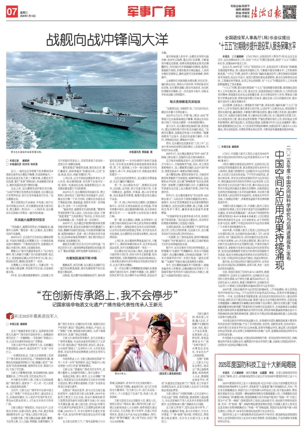 2025年度國(guó)防科技工業(yè)十大新聞包括:紀(jì)念中國(guó)人民抗日戰(zhàn)爭(zhēng)暨世界反法西斯戰(zhàn)爭(zhēng)勝利80周年大會(huì)舉行,多款新型“大國(guó)重器”集中亮相閱兵式;天問(wèn)二號(hào)任務(wù)發(fā)射圓滿成功,我國(guó)開(kāi)啟小行星探測(cè)與采樣返回之旅;原子能法頒布,聚變能發(fā)展備受關(guān)注;我國(guó)第一艘電磁彈射型航空母艦福建艦入列,三型艦載機(jī)完成首次彈射起飛和著艦訓(xùn)練;我國(guó)規(guī)模最大的天然鈾產(chǎn)能項(xiàng)目“國(guó)鈾一號(hào)”示范工程生產(chǎn)出“第一桶鈾”;國(guó)家國(guó)防科工局設(shè)立商業(yè)航天司,商業(yè)航天持續(xù)快速發(fā)展;天問(wèn)一號(hào)“驚鴻一瞥”,神秘阿特拉斯彗星特征明顯;中國(guó)載人航天工程首次應(yīng)急發(fā)射任務(wù)取得圓滿成功;“和福一號(hào)”揚(yáng)帆起航,我國(guó)首批商用堆產(chǎn)碳-14同位素投入市場(chǎng);殲-10CE首次取得實(shí)戰(zhàn)戰(zhàn)果引發(fā)全球關(guān)注。