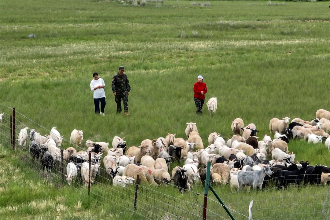 圖為布和圖木爾(中)到牧區(qū)草場實地走訪。