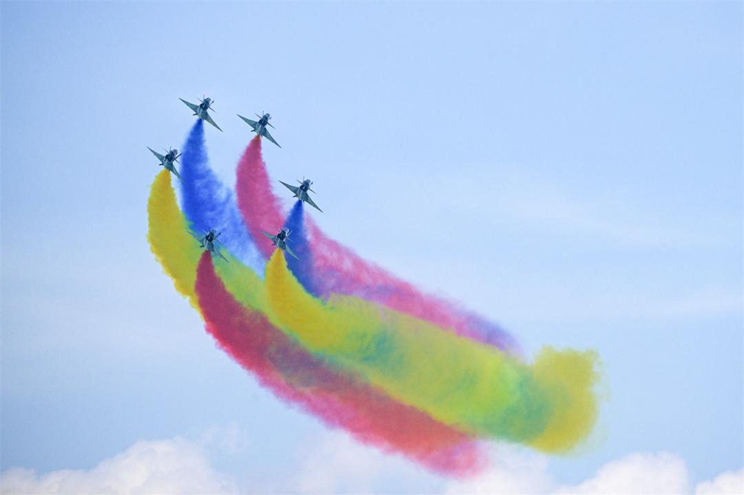 13時許,噴涂中國國旗和八一軍徽的表演機抵達(dá)樟宜展覽中心海面上空,率先編成超密集六機大箭隊,在空中拉出紅、黃、藍(lán)3種顏色6道彩煙,以低空通場形式展現(xiàn)特殊禮儀,用“彩虹”向各國來賓致以最真摯的問候。