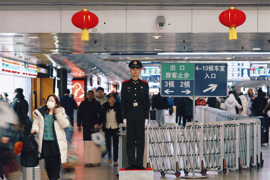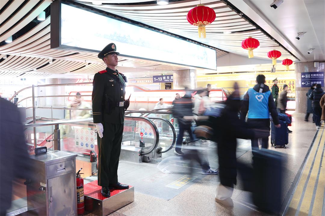 武警北京總隊(duì)執(zhí)勤第六支隊(duì)官兵堅(jiān)守一線,在車站各重點(diǎn)區(qū)域全時(shí)值守,以挺拔身姿維護(hù)現(xiàn)場(chǎng)秩序,全力筑牢春運(yùn)出行安全屏障。