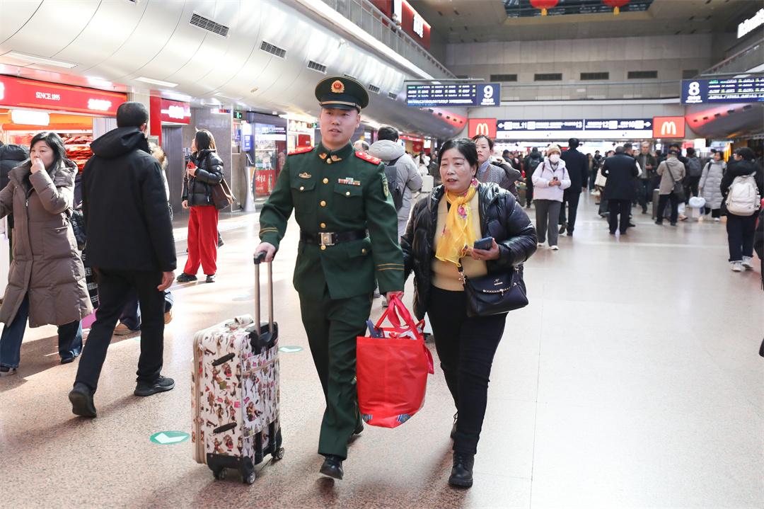 在人員密集的車站進站口、安檢區(qū)、候車大廳、檢票口等關(guān)鍵點位,官兵們始終保持高度警惕,緊盯旅客動態(tài),細致排查各類安全隱患。遇有攜帶大件行李的旅客、行動不便的老人或身有殘疾的特殊旅客,官兵們第一時間主動上前,接過沉重的行囊,耐心引導(dǎo)至候車專區(qū)、綠色通道,協(xié)調(diào)車站工作人員開通“返鄉(xiāng)優(yōu)先通道”,全程幫扶特殊旅客進站乘車。