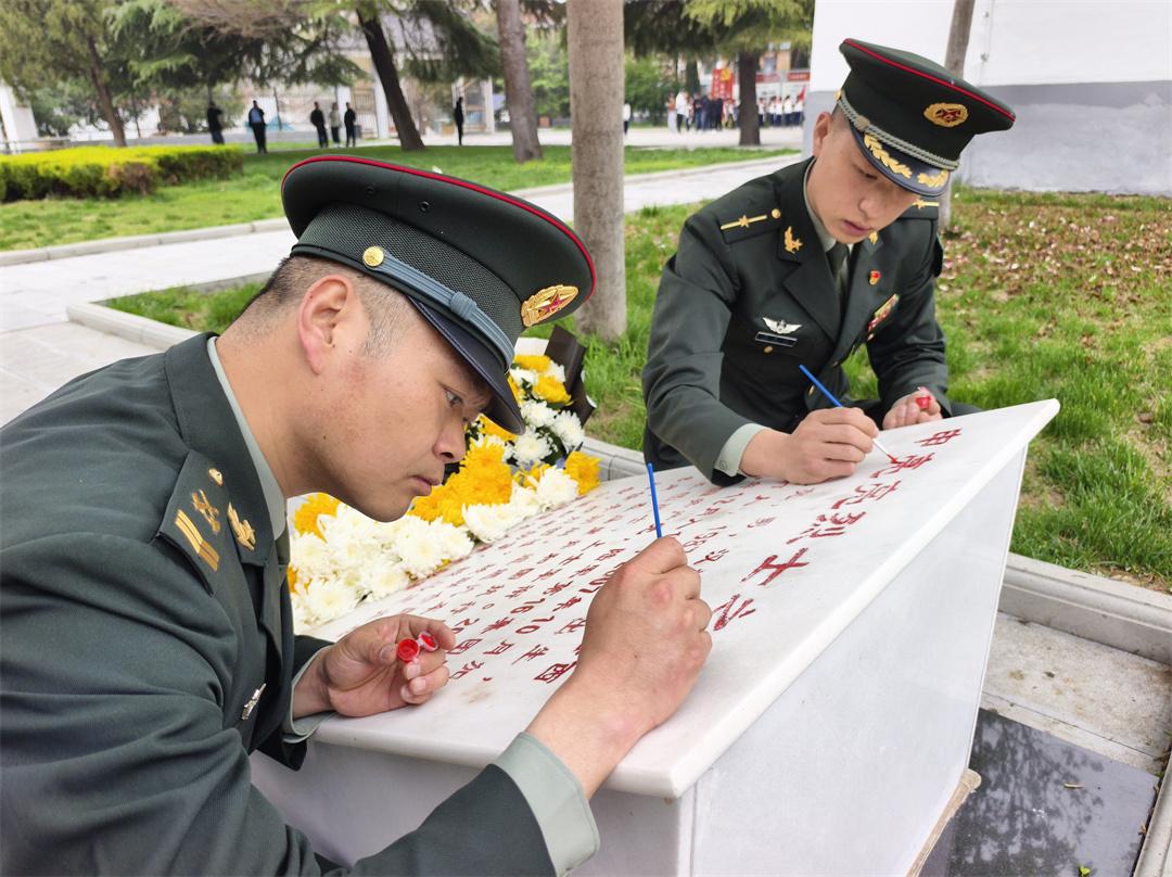 圖為申亮亮的戰(zhàn)友來到溫縣烈士陵園為英雄臥碑描紅。
