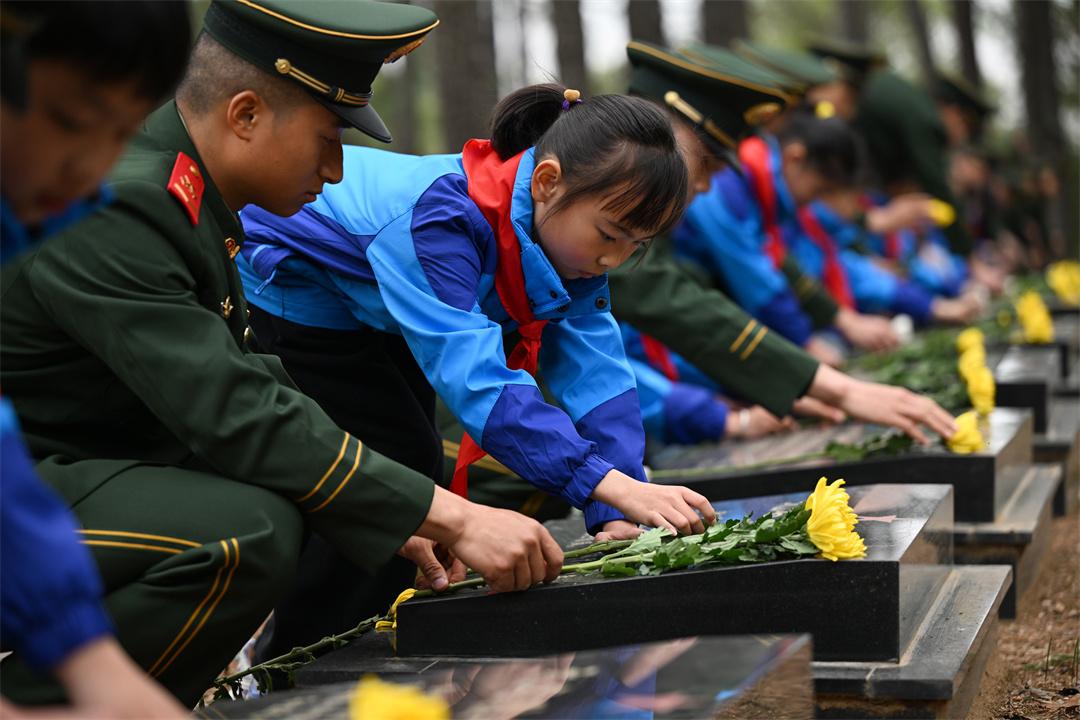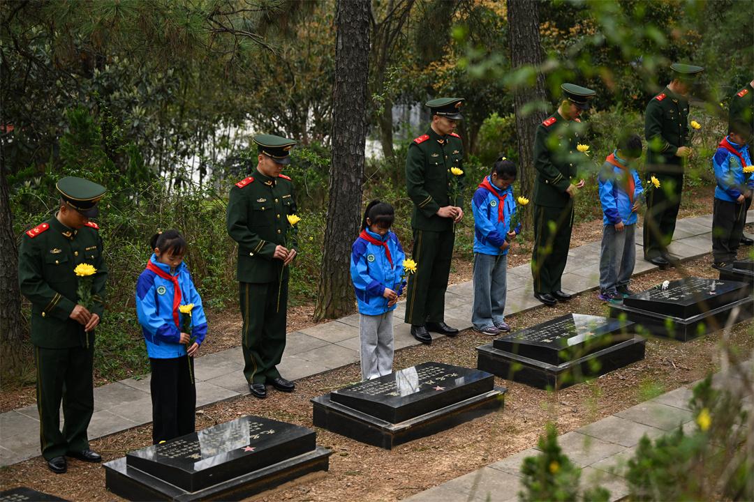 圖為官兵和學(xué)生們向烈士獻(xiàn)花。