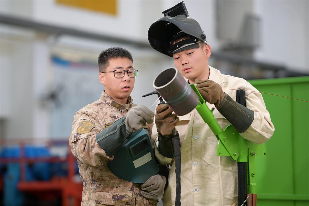 圖為王江帆正在向新同志傳授焊接經(jīng)驗(yàn)。