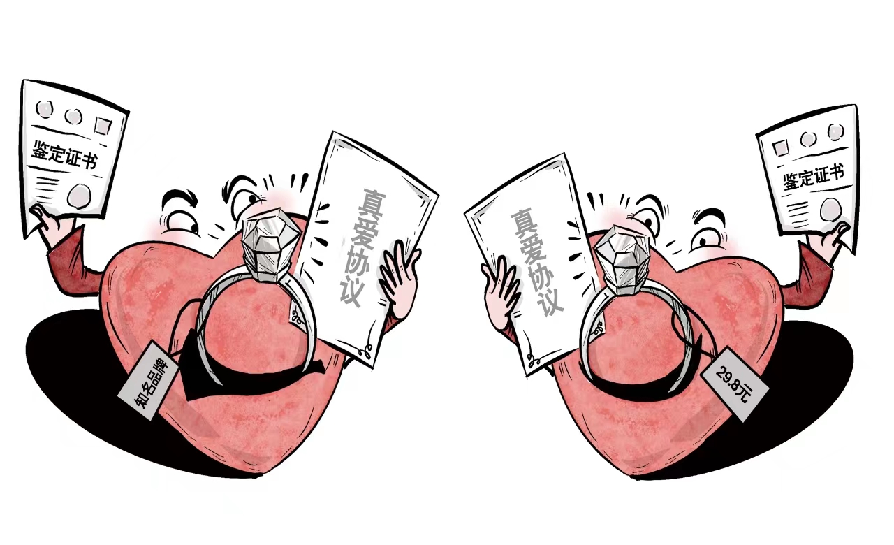 近日,據(jù)媒體報(bào)道,在七夕佳節(jié)前,電商平臺(tái)上又涌現(xiàn)出一批廉價(jià)求婚鉆戒,價(jià)格在幾十元不等,還可以定制配套的“真愛協(xié)議”、珠寶鑒定證書以及包裝禮盒,銷售火爆。有記者調(diào)查發(fā)現(xiàn),這些商品都是某知名品牌鉆戒的“山寨版”,進(jìn)貨價(jià)甚至可能只有個(gè)位數(shù)。