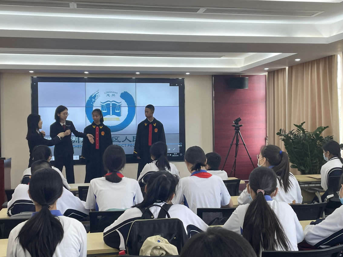 同學們在法官助理的引導下參觀了大鵬法庭,法官助理用通俗易懂的語言介紹了法庭設(shè)置、審判職能和審判流程,向同學們揭開法庭的神秘面紗,讓同學們對法庭和審判有了直觀感受。大鵬新區(qū)政法辦工作人員對公檢法職能及相互關(guān)系進行了介紹。針對同學們關(guān)心的問題,法官助理通過以案說法、體驗式學法、視頻科普、提問互動等寓教于樂的授課方式作了專業(yè)解答,同學們豁然開朗。