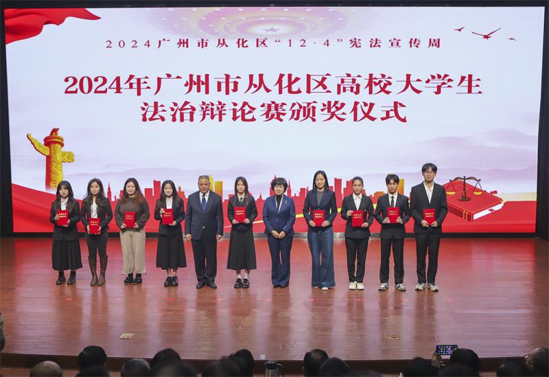 廣州南方學(xué)院的開場舞蹈《溯源》以獨特的藝術(shù)形式,展現(xiàn)了法治文化的深厚底蘊;從化區(qū)委政法委、區(qū)檢察院、區(qū)法院、區(qū)司法局、區(qū)公安分局的青年們帶來了朗誦節(jié)目《憲法頌》,傳遞出對憲法的崇高敬意和堅定信仰;舞蹈《這一束光》則將抽象的憲法知識轉(zhuǎn)化為具象的舞蹈形象,讓孩子們用身體語言表達對憲法的理解和感悟;快板音樂劇《跟我一起學(xué)憲法》,巧妙融合了傳統(tǒng)快板藝術(shù)與現(xiàn)代教育理念,以生動活潑的形式引領(lǐng)大家走進憲法的神秘殿堂。最后,歌曲《歌唱祖國》將全場氣氛推向了高潮。除了文藝表演,當天還舉辦了“2024年度廣州市從化區(qū)高校大學(xué)生法治辯論賽”頒獎活動,9所高校代表、9名優(yōu)秀指導(dǎo)老師、11名優(yōu)秀辯手上臺領(lǐng)獎。