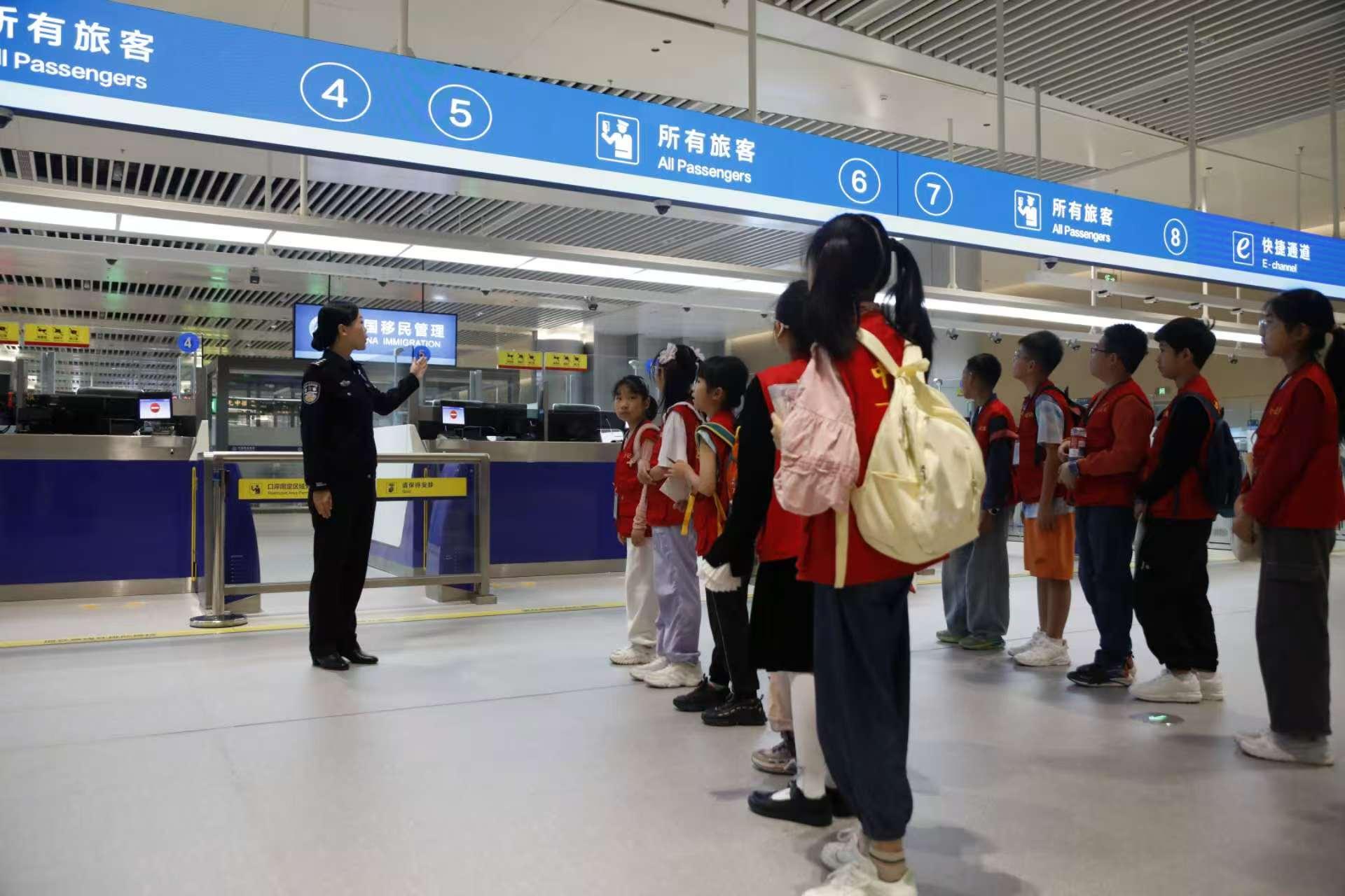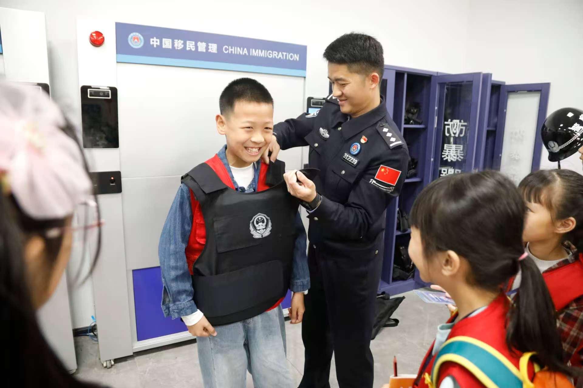 小學生們在移民管理警察的帶領(lǐng)下,先后參觀了新口岸出境大廳、碼頭泊位及入境大廳,現(xiàn)場體驗穿戴警用裝備。