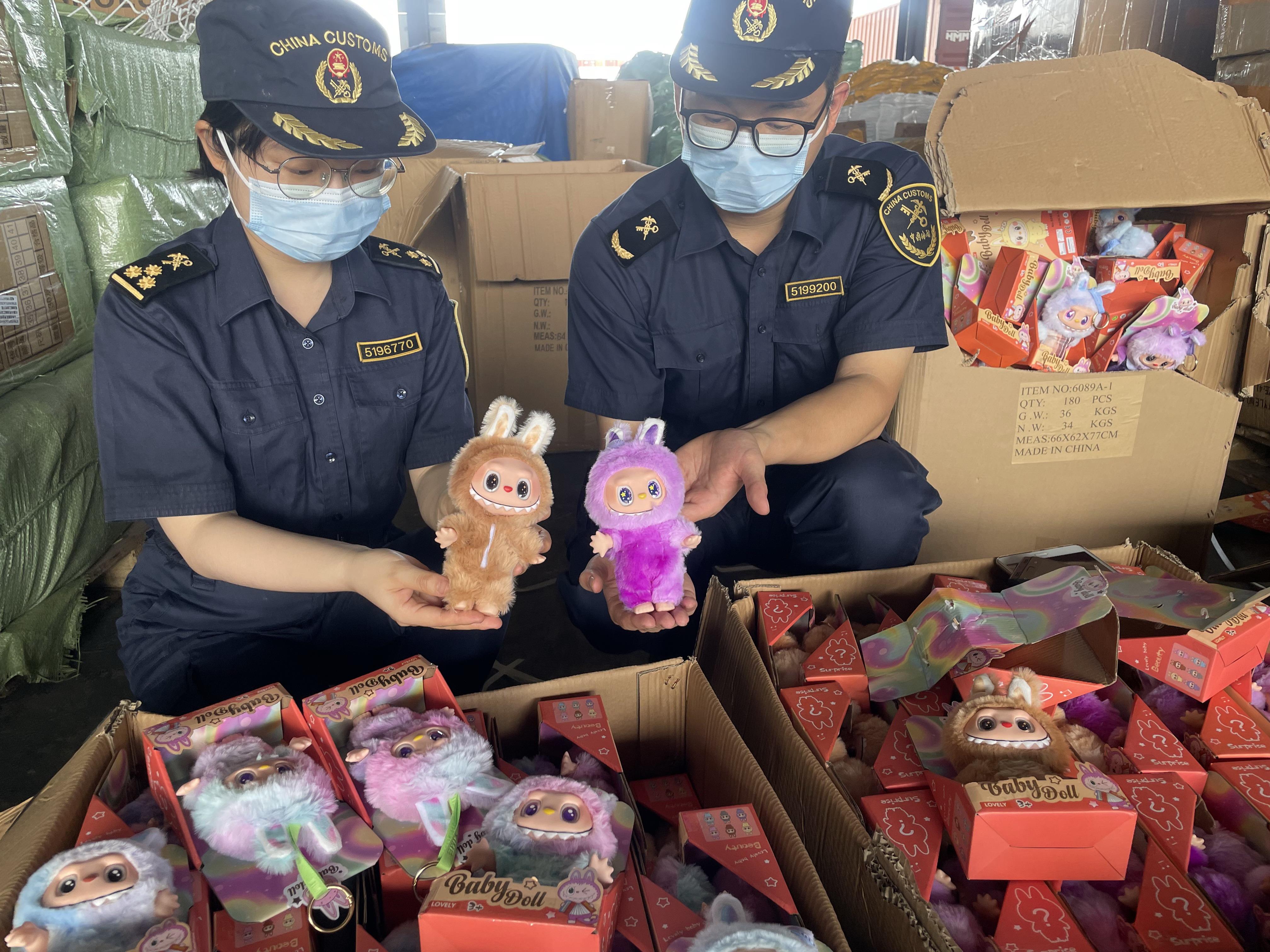 廣州海關所屬南沙海關關員在對一票申報為“玩具”的出口貨物進行查驗時,發(fā)現(xiàn)該批貨物申報為“無品牌”,但紙箱中的毛絨玩具與泡泡瑪特當前熱門的Labubu系列產(chǎn)品高度相似。經(jīng)聯(lián)系相關知識產(chǎn)權權利人確認,上述貨物為涉嫌侵犯其知識產(chǎn)權的產(chǎn)品。